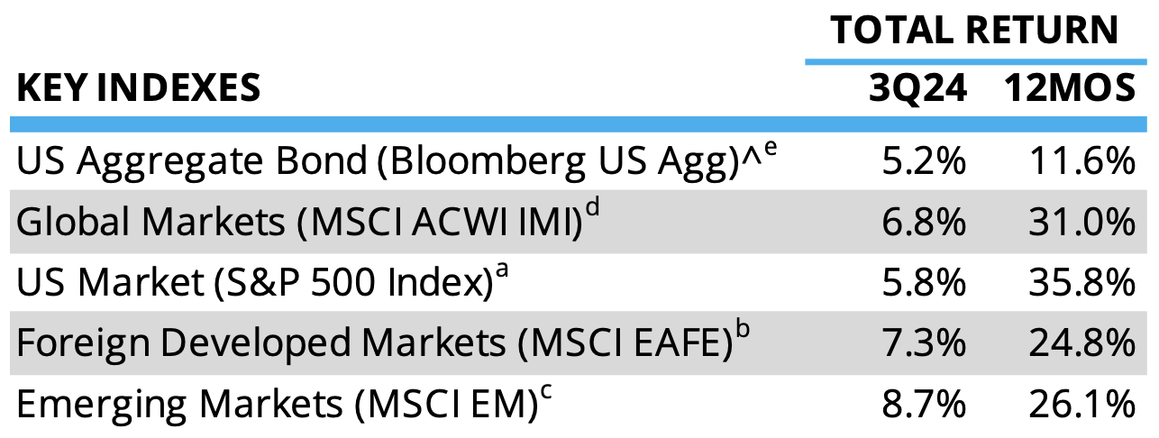 The beginning of the Federal Reserve (Fed) rate cutting cycle made for a cracker of a quarter for most investment classes. Global equities markets (MSCI ACWI IMI)^d turned in a total return of 6.8%. As in the second quarter, emerging markets (MSCI EM)c once again had the strongest performance among equity regions, up 8.7% on the back of major fiscal and monetary announcements by the Chinese government. Fixed income also performed well—US bonds (Bloomberg US Aggregate Index)e were up an impressive 5.2%.