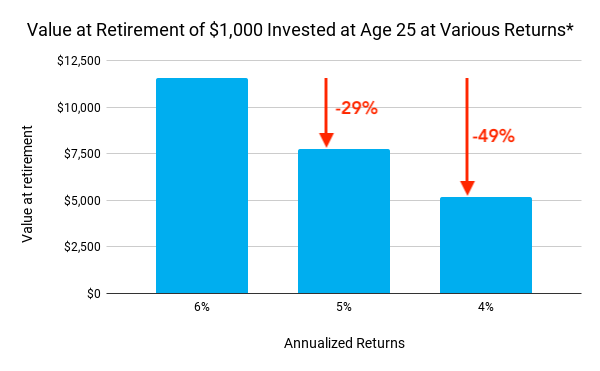 For example,1 $1,000 invested at age 25 grows to $11,557 at full retirement age (67) assuming a 6% annual compound rate of return. If you wait until 35 to make that investment (scaled up to $1,280 to account for 2.5% annual inflation to make a fair comparison), you get 29% less at retirement. And waiting to age 45, you are looking at 49% less.