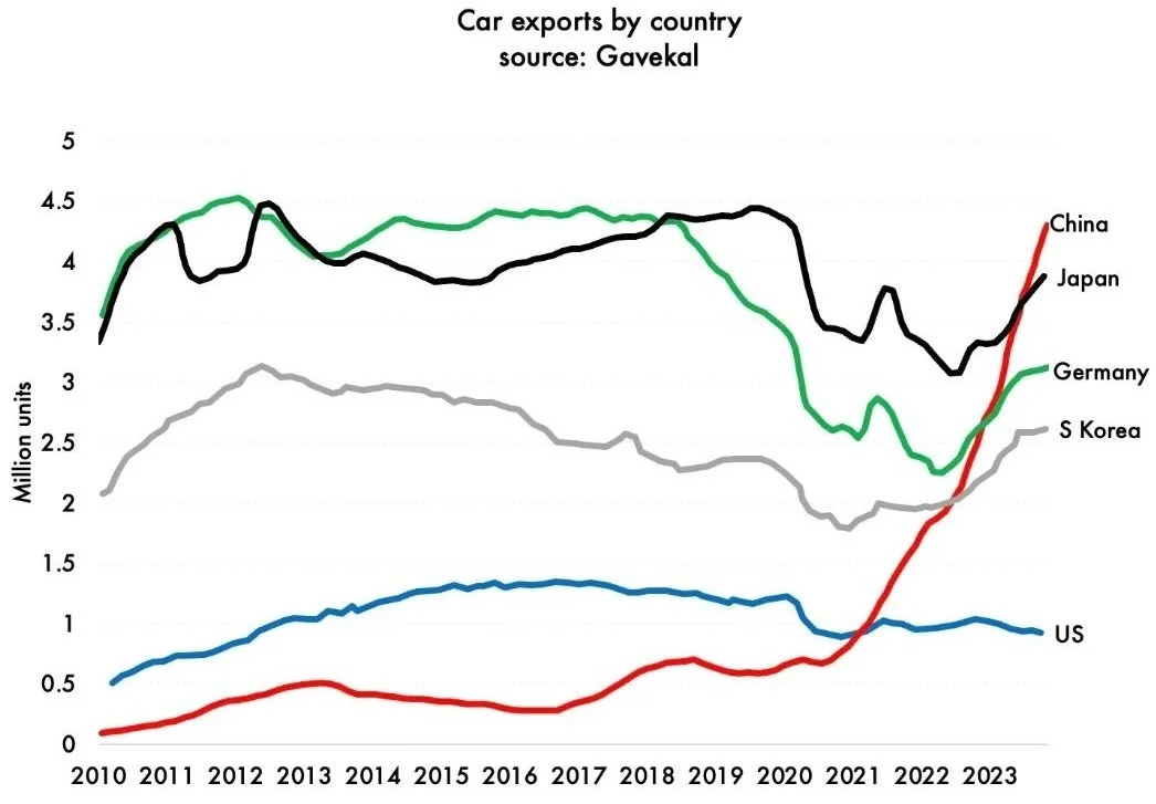 Regardless of election outcomes in the West, the economic and military rivalry between the West and China continues to heighten. Back in 2018 and 2019, the Trump administration applied tariffs on approximately $380 billion of Chinese imports, tariffs the Biden administration mostly retained. In May, the Biden administration announced additional tariff hikes on $18 billion of Chinese imports, including a 100% tariff on Chinese electric vehicles that effectively locks them out of the US market. The EU quickly followed the US’s lead by imposing new tariffs of up to 37.6% on Chinese EVs, this on top of its standard 10% duty on all imported automobiles. Canada is expected to increase its tariffs on Chinese EVs in the near future. Chinese EVs dominate markets where they do not face penalizing tariffs. For example, over 80% of EVs sold in Australia this year have been Chinese. On the back of its cost competitiveness in EVs, China is now the largest auto exporter in the world as shown in the following chart.