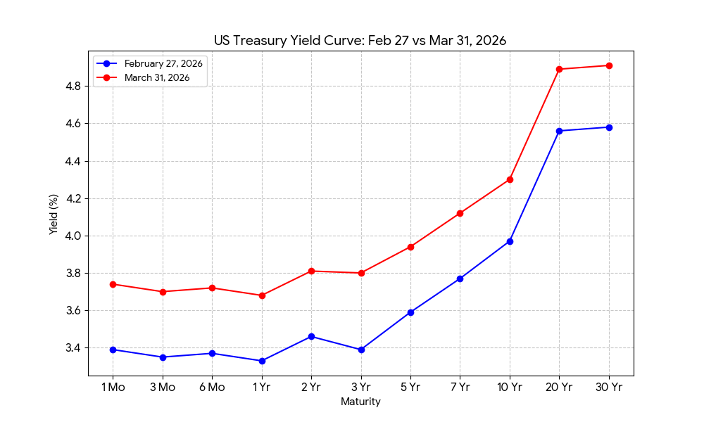 US inflation continues to run well above the Federal Reserve’s (Fed’s) 2% target, with the Fed’s most recent reading of its preferred inflation gauge [Core Personal Consumption Expenditures (PCE) Price Index] rising at an annualized rate of 4.4%. This was through February, before the flow through of higher energy prices caused by Iran’s blockade of the Strait of Hormuz. The worsening inflation picture combined with the Iran war’s negative impacts on the US government’s deficit (earlier this month the White House requested a 40% increase in defense spending, to $1.5 trillion, for fiscal year 2027) have caused investors to reign in their expectation for further Fed rate cuts. As a result, Treasury interest rates across all durations expanded significantly during the month of March, as shown below.