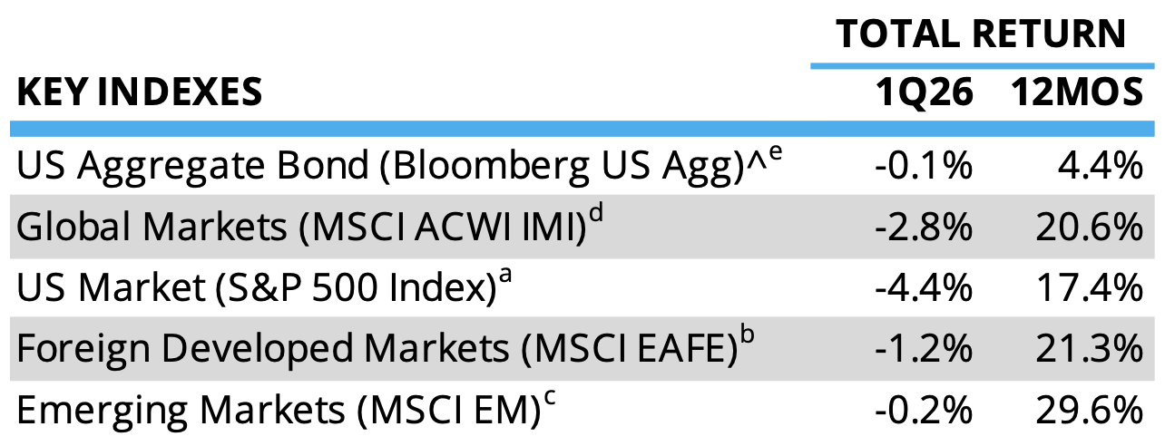 Global investment markets lost their strong momentum from 2025 when US and Israel initiated five plus weeks of aerial attacks against Iran in late February. The global equity market, as measured by the MSCI ACWI IMI Index,^d was down 2.8% during the quarter. The US equity market (S&P 500a) led the downturn, experiencing a 4.4% decline, while foreign developed markets (MSCI EAFEb) fell 1.2% and emerging markets (MSCI Emerging Markets Indexc) dropped 0.2%. Fixed income markets treaded water during the quarter—our fixed income benchmark, the Bloomberg US Aggregate Index,e was down 0.1% during the quarter.